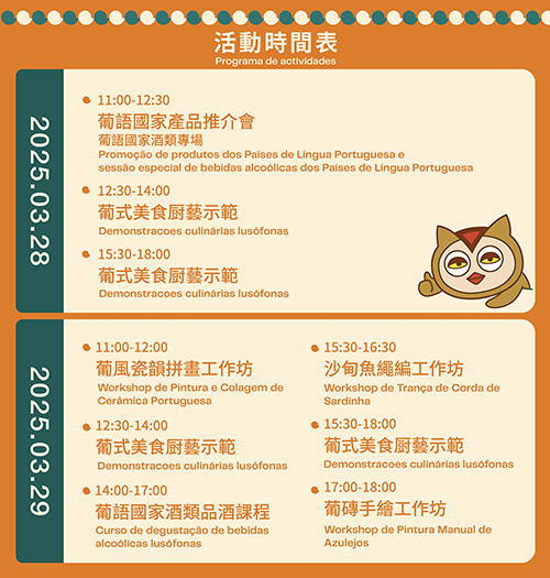 活動更圍繞葡語國家文化和特色產品策劃多項精彩安排。首日活動將推出葡語國家酒類產品推介會,匯聚各式葡語國家佳釀,集中進行商貿洽談;還將舉辦葡式美食廚藝示範,邀請澳門網絡達人廚師現場烹飪葡國雞、薯絲塔等葡式美食。