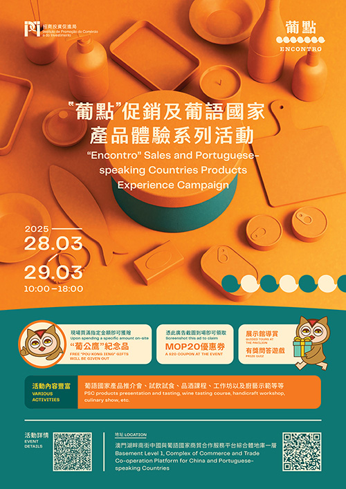 【本報訊】為讓公眾近距離感受葡語國家產品及文化的獨特魅力,招商投資促進局將於本週五及週六(28及29日)首辦“‘葡點’促銷及葡語國家產品體驗系列活動”;其中,設於中國與葡語國家商貿合作服務平台綜合體地庫一層的“葡點(Encontro)”將展銷超過350款物美價廉的葡語國家產品,同場舉行10場工作坊、品酒課程、廚藝示範及產品推介活動。招商投資促進局歡迎公眾親蒞現場出席活動,或透過連結(https://wk.wkebcc.com/index/h5/gzfsignup)報名參加活動工作坊。