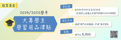 【本報訊】據教育及青年發展局消息,教育基金2024/2025學年大專學生學習用品津貼由本月7日起至5月30日接受登記,符合津貼發放條件的大專學生可獲發澳門元三千三百元學習用品津貼。