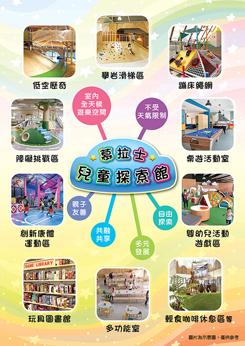 兒童探索館的一樓總面積約3,000平方米,計劃分六大區塊,遊戲設施對象年齡段為12歲或以下兒童,計劃設施包括低空歷奇、攀岩滑梯區、爬網、滑梯障礙挑戰區、嬰幼兒活動遊戲區、工作坊、多功能室、桌遊室、玩具圖書館及輕食咖啡休息區。二樓總面積約3,500平方米,計劃分五大區塊,遊戲設施對象年齡段為6至18歲,設施包括蹦床樂園、探索網道、康體挑戰區、創新康體運動區及桌遊活動室等。