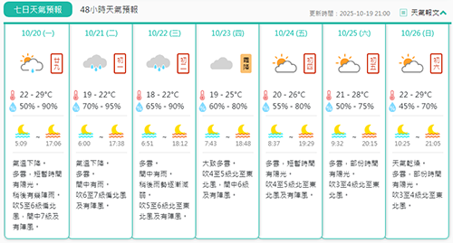 氣象局的七日天氣預報顯示,今日多雲,短暫時間有陽光,初時有一兩陣驟雨,吹5至6級偏北風,間中7級及有陣風,最高氣溫約為29℃, 晚間氣溫將下降至最低約22℃。週二氣溫將下降至19℃至22℃,多雲和間中有雨,吹六至七級偏北風及有陣風。週三最低氣溫料進一步下降至18℃,多雲且間中有雨,雨勢稍後逐漸減弱,吹五至六級北至東北風及有陣風。
