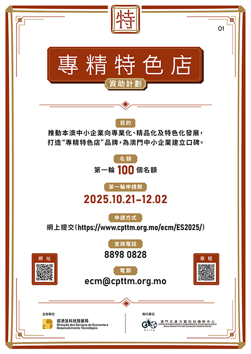 【本報訊】為協助本澳中小企業轉型升級,向專業化、精品化及特色化發展,增強整體競爭力,工商業發展基金委託澳門生產力暨科技轉移中心執行的第一輪“專精特色店資助計劃”,將於今日起至12月2日接受申請,首輪申請期設有100個名額。