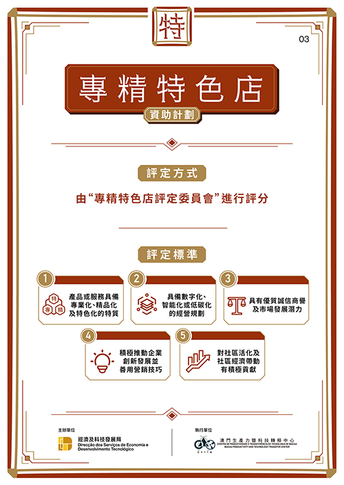 據介紹,是次資助計劃的對象為餐飲或零售業的中小企業,獲評定為“專精特色店”的中小企業,就其線上營銷、打造特色店面以及推出IP聯乘商品等指定費用,可獲六成資助,最高資助上限為15萬澳門元。有意申請的企業須具備“誠信店”資格,並提交自行擬訂的商業計劃書及經營方案。