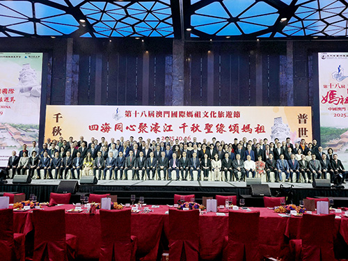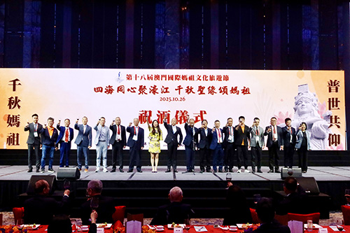 莆田湄洲媽祖祖廟董事長林金贊致辭時表示,澳門與媽祖文化的融合,早已融入城市血脈,媽祖文化在此落地生根,與澳門的發展同呼吸、共成長,成為維繫內地與澳門的精神紐帶,更鑄就連接全球華人的文化基因。湄洲媽祖祖廟作為媽祖文化重要傳承地,始終與澳門媽祖文化界保持著深厚的情誼與緊密聯繫,從共慶民俗盛典到共研文化精髓,從互派交流團到攜手推動媽祖文化申遺,見證著兩地情誼從相知走向相融。