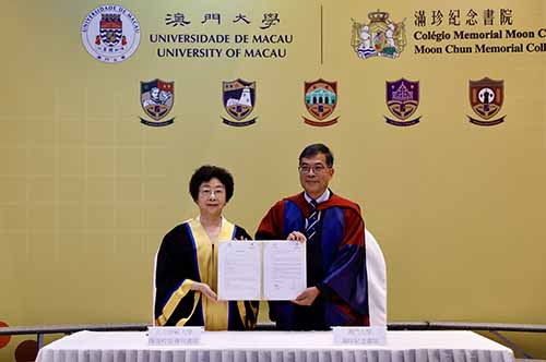 在澳大滿珍紀念書院高桌晚宴上,該院院長張國祥及北京師範大學珠海校區會同書院執行院長虞立紅代表簽署備忘錄。兩院師生在場見證。