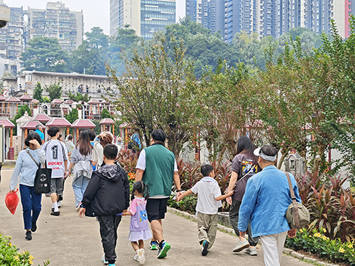 重陽節傳統上要慎終追遠,不少孝子賢孫昨日上午帶備鮮花祭品上山祭拜先人,各墓園湧現掃墓人潮,祭掃秩序井然,祭拜人群均在使用化寶爐焚燒冥鏹後,自覺清理環境。與此同時,有警員在各個掃墓地點周邊路段加派警力維持秩序,疏導交通,消防亦在場戒備,整體秩序良好。有居民受訪表示,每年春秋二祭,都會帶小朋友一同掃墓,除緬懷祖輩外,亦可讓他們深入認識傳統節日。