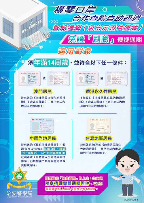 使用橫琴口岸合作查驗自助通道“刷臉”智能通關的人士須年滿14周歲,並符合以下任一條件: