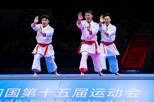 坐擁主場優勢的澳門隊昨日在空手道男子業餘團體型比賽亮相即傳來喜訊,於2023年杭州亞運會為澳門贏得空手道團體型銀牌的三人組合郭建恆、方文浩和鄭沘珞在比賽中一路過關斬將,先是在上午的16強打出一套“敖漢”以39.7比35.3擊敗北京代表隊後,再在下午的8強戰及準決賽分別打出“久留頓破”及“安南大”,以41.1比34.5及41.1比34.3戰勝貴州代表隊及山東代表隊,成功闖入決賽。在決賽中,三人面對香港隊的挑戰,憑藉套路動作“安南”穩定且剛勁十足的發揮,以42.7分比40.4分擊敗對手,成功為澳門代表團奪得今屆全運會首面獎牌,也是澳門參加全運會以來首面金牌。廣東隊和貴州隊並列第三名。