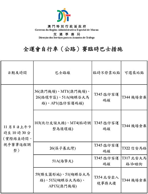 澳門臨時交通和巴士措施方面,澳門大橋及偉龍馬路的部分引橋在當日凌晨2時起封閉交通,氹仔北安部分馬路和港珠澳邊檢南大馬路在上午7時起實施通行限制;另外,兩個巴士站當日上午9時起臨時停用,預計11條巴士線受影響,相關措施預計於10時30分結束(實際結束時間,視乎賽事進程調整)。此外,港珠澳大橋邊檢大樓東公共停車場、氹仔客運碼頭停車場及其上落客區和下層的士站實施進出限制,休聞企業接駁巴士亦臨時停運,以配合賽事舉行。具體措施可查閱交通事務局網站內的相關專頁(https://www.dsat.gov.mo/dsat/subpage.aspx?a_id=1761534451)。