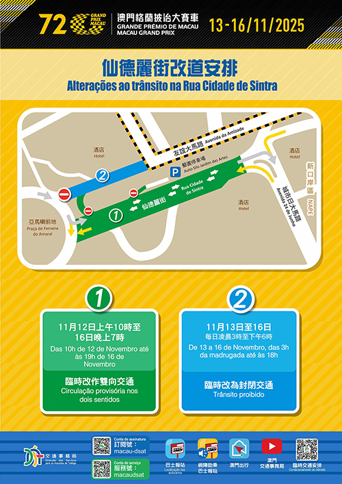 因應大賽車的舉行,今日起至週日期間,賽道及周邊道路分階段實施多項臨時交通管制措施,當中亞馬喇前地與城市日大馬路之間一段仙德麗街臨時由單向改為雙向交通,而福海花園與新雅馬路行車天橋之間的一段新雅馬路臨時改作反方向通車。此外,明日起至週日合共52條巴士路線需作臨時安排,2A特班車(2AS)及H2路線停運,12T及31T免費穿梭巴士路線分別往返外港碼頭至亞馬喇前地及綜藝館。為加強疏導賽道周邊的交通,經跨部門協調,友誼圓形地行車天橋B匝道(由A區往東北大馬路)已通車,黑沙環中街輕軌東線工程及東北大馬路行人天橋工程調整大賽車期間的施工安排,以釋放路面空間。具體的臨時交通及巴士調整可瀏覽交通事務局網站專頁(https://www.dsat.gov.mo/dsat/subpage.aspx?a_id=1761559294)。
