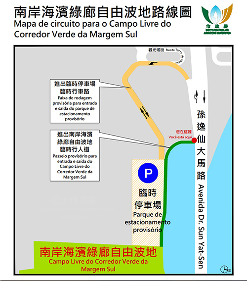 由於南岸海濱綠廊二期整體工程尚未完成,為方便公眾使用一區設施,經交通事務局協調及考慮周邊的交通環境,於一區旁設置了可停泊110輛汽車及約100輛電單車的臨時停車場,車輛可經觀光塔街進出,行人亦可經設於孫逸仙大馬路的臨時行人道出入。