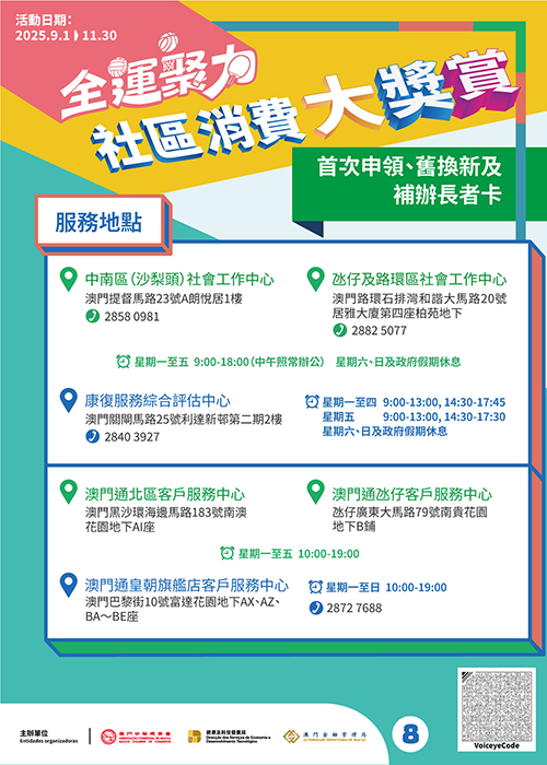 “全運聚力‧社區消費大獎賞”活動為長者及持殘評證人士額外提供的500元長者卡及關愛卡消費立減優惠不能重複領取,已持有長者卡的殘疾長者僅可透過長者卡領取優惠。所有在本月28日或之前年滿65歲的長者可於活動期間憑新版澳門通長者卡,到本澳逾100個指定服務地點拍卡,領取500元的消費立減優惠。首次申領、舊換新及補辦澳門通長者卡的服務今日截止,有需要的長者可前往澳門通三個服務中心、中南區(沙梨頭)社會工作中心、氹仔及路環區社會工作中心,以及康復服務綜合評估中心辦理。