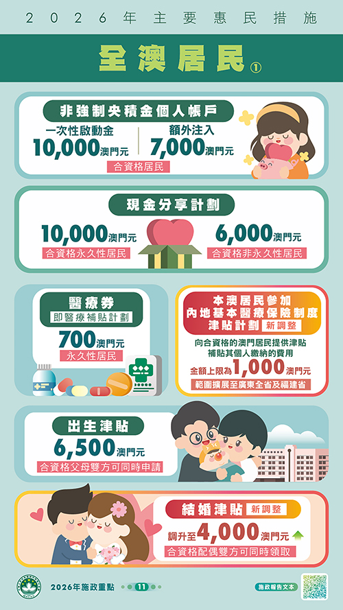報告從九個方面部署特區政府明年施政重點,當中關於“優化民生制度體系,切實辦好民生實事”方面提到,明年將落實系列惠民措施,包括繼續實施現金分享計劃,合資格永久性居民繼續獲發1萬元,合資格非永久性居民6,000元。此外,推動福利向低收入群體和弱勢、困難群體傾斜,向援助金受益家庭額外多發放一個月全額援助金,調升“三類弱勢家庭特別補助”和“社會融和計劃”的發放金額,降低照顧者津貼申請門檻,擴大適用對象,調升照顧者津貼至每月2,400元。同時,持續發放社會保障給付及各種津貼,並將失業津貼調升至每日210元,疾病津貼調升至非住院每日180元、住院每日240元,喪葬津貼調升至5,200元,而結婚津貼則調升至4,000元,合資格配偶雙方可同時領取。為應對少子化問題,明年繼續向澳門永久性居民中的3歲以下嬰幼兒每月發放1,500元育兒津貼。