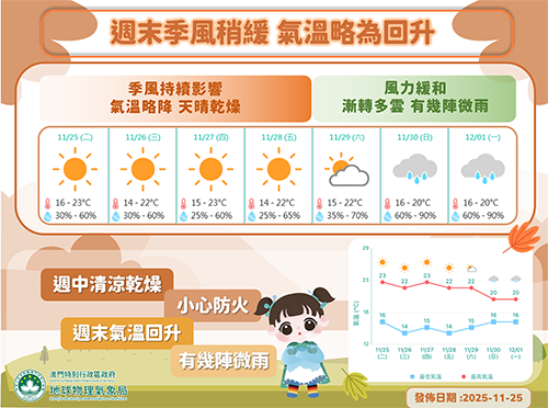 氣象局昨日天氣“特別推送”消息指,隨著兩股東北季風分別於昨日及週四抵達華南沿岸,週中氣溫下降,天氣雖以晴朗為主,但極為乾燥,早晚相當清涼。此外,現時位於菲律賓附近的熱帶氣旋“天琴”正逐漸發展,預料在本週中後期橫過南海中南部,大致趨向越南附近,與本澳保持較遠距離,直接影響機會低。隨著東北季風週末至下週初(11月29日至12月1日)稍為緩和,本澳氣溫將略為回升,同時天色會漸轉多雲,及有幾陣微雨。