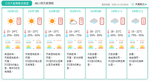 根據氣象局的七日天氣預報,今日氣溫略降,天氣極為乾燥,吹3至4級偏北風,間中5級及有陣風,氣溫約為15℃至24℃。週四至週六天氣同樣乾燥,最低氣溫在14℃至16℃之間。週日至下週二氣溫略有回升,有幾陣雨或幾陣微雨。