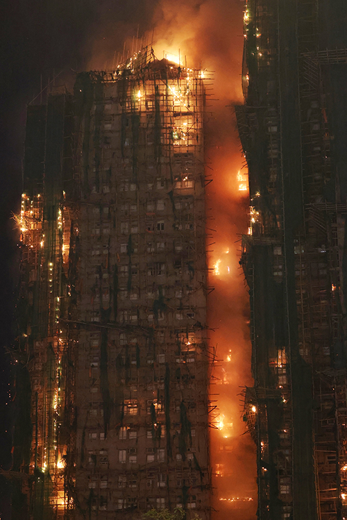 截至昨晚午夜12時許,火災還未撲滅。據香港中通社報道,昨晚10時許,現場仍不時傳出爆炸聲,7棟起火的大廈從外部觀察,其中 3棟大樓仍然整棟燃燒,其他大樓部分樓層冒出火光,1棟火勢原來較小的大樓中低層突然燃起烈火,消防人員仍在不斷射水降溫。現場有消防無人機不時在空中勘察火場,住宅附近的橋站滿了關注火警的市民。有住戶受訪表示,下班到家後才發現火災,也有住戶說自己因為出門所以逃過一劫。