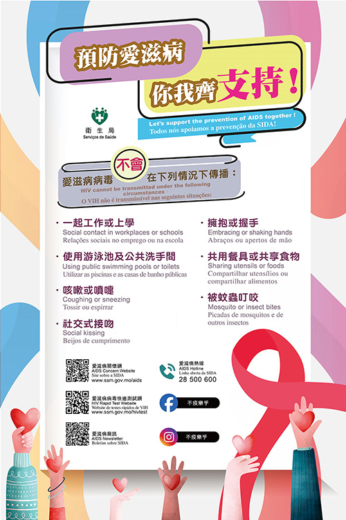 衛生局透過“資源下沉”持續與社區組織合作提供免費的愛滋病病毒快速測試服務,包括澳門工會聯合總會工人醫療所、婦聯婦女醫療中心、澳門中華新青年協會信和醫療中心、澳門關懷愛滋協會和澳門基督教新生命團契S.Y.部落;此外,衛生局也提供網上購買自我檢測套裝的服務,為不便前往服務點檢測的人士提供更多選擇。詳情可瀏覽衛生局愛滋病病毒快速測試網頁(www.ssm.gov.mo/hivtest)。