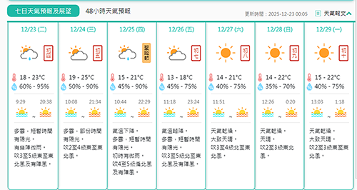 一股東北季風正影響本澳天氣。根據氣象局七天天氣預報,今日多雲,短暫時間有陽光,有幾陣微雨,吹3至5級東至東北風及有陣風,氣溫約為攝氏18℃至23℃,相對濕度介乎百分之60至95之間。明日平安夜多雲,部分時間有陽光,吹2至4級東至東北風,氣溫約為攝氏19℃至25℃,相對濕度介乎百分之50至90之間。週四聖誕節多雲,短暫時間有陽光,氣溫將跌至15℃至2℃。週五拆禮物日同樣多雲,短暫時間有陽光,最低氣溫或進一步降至 13℃。