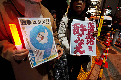 集會現場,抗議者高喊“維護憲法”“不要煽動戰爭”等口號。日本社民黨黨魁福島瑞穗在集會上發表演講,批評政府安保政策的走向。她指出,首相官邸負責安保政策的官員公然談及“擁核”,動搖了日本長期堅持的“無核三原則”。高市內閣是一個“準備戰爭的內閣”。防衛預算不斷攀升,其走勢越來越讓人聯想到二戰前的日本。福島強烈要求高市撤回涉台錯誤言論,強調該表態明顯違反憲法第九條。