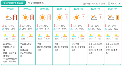 氣象局預料今明兩天仍寒冷,展望隨後數日早晚清涼,日間天晴乾燥,日夜溫差較大,下週中期氣溫逐漸回升,雲量增多。根據氣象局的七日天氣預報,今日天氣寒冷及乾燥,多雲,部分時間有陽光,吹4至5級北至東北風,間中6級及有陣風,氣溫約為11℃至18℃,相對濕度介乎百分之40至70之間。明日天氣乾燥,大致天晴,氣溫約為12℃至22℃,吹2至4級東北風。週日天晴,氣溫略回升至14℃至22℃,吹2至3級東至東北風。