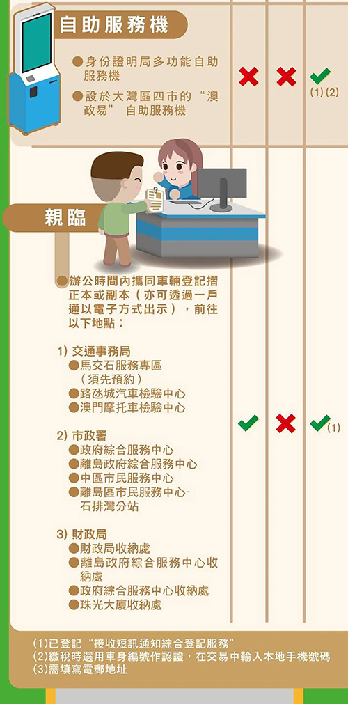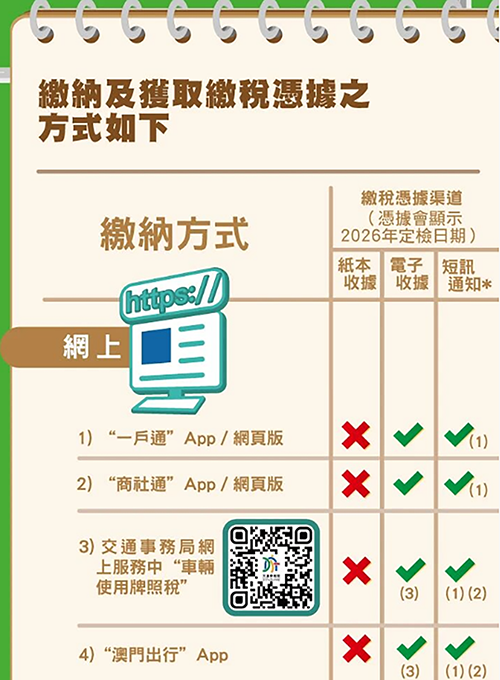 【本報訊】據交通事務局消息,2026年度車輛使用牌照稅(俗稱“行車稅”)將於2026年1月1日至3月31日期間徵收。居民可透過交通事務局網上服務、“一戶通”App/網頁版、“商社通”App/網頁版、“澳門出行”App、身份證明局多功能自助服務機、設於大灣區四市的“澳政易”自助服務機,或親臨交通事務局、市政署或財政局轄下指定地點繳納稅款。