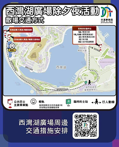 另外,路氹金光大道今晚亦會舉行跨年倒數活動及煙花表演,屆時會實施特別交通安排,包括晚上10時至11時的有限度通車措施,以及晚上11時至翌日凌晨1時的封路措施。