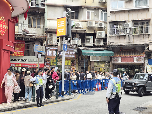 昨日中午,關閘廣場訪澳旅客大軍壓境,旅遊巴停泊區候車客大排長龍,的士和地下巴士站同樣候車人數眾多。下午,中區一帶人流增多,新馬路、南灣大馬路及殷皇子馬路交界人流密集,治安警先後於下午2時15分及5時20分實施人潮管制措施。人潮管制期間,大三巴街行人只可單向上行前往牌坊,並取道周邊的街巷如大關斜巷、關前後街、高園街等離開。此外,關前後街的行車道亦同時封閉,車輛從營地大街駛至該路口時必須左轉入草堆街,同時因應大三巴實施單向人潮措施,車輛不能由高園街左轉大三巴斜巷。有關人潮管制措施及後於下午4時半及6時10分取消。