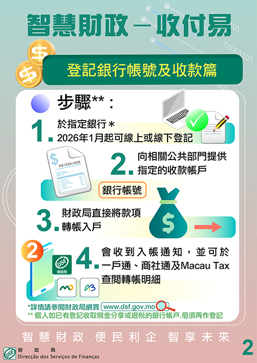 財政局將自今年3月起按所提供的登記資料把款項直接存入指定賬戶,屆時,收款人毋須再持單兌現,可大幅縮短辦理時間並提升資金到賬效率。完成轉賬後,系統會發出入賬通知。收款人亦可經“一戶通”、“商社通”及“Macau Tax”查閱轉賬明細,方便即時核對與保存紀錄。