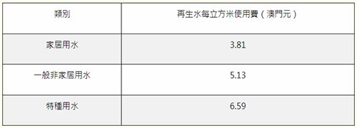 據海事及水務局公佈, 為確保珍貴的水資源不被浪費,基於“用者付費”原則,再生水使用費與飲用水價格機制中相應用戶類別的使用費掛鈎,但家居用戶的再生水使用費不設階梯式收費,僅與飲用水第一階使用費掛鈎。再生水的家居用水每立方米價格為3.81元、特種用水每立方米價格為6.59元、一般非家居用水每立方米價格為5.13元。