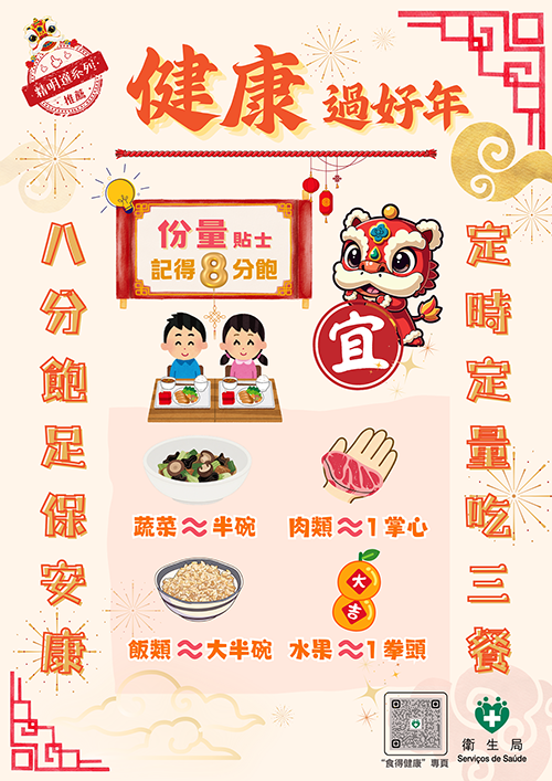 【本報訊】新春佳節將至,連串聚餐和應酬接踵而來,如不控制飲食,或對身體健康構成風險。衛生局昨日舉行“新春健康飲食新聞發佈會”,引導居民建立節日健康飲食觀,共建健康社區。出席發佈會的仁伯爵綜合醫院內科醫生李宗煜表示,隨著本澳踏入老齡化社會,居民飲食模式轉變以及外賣普及等因素,“三高”和肥胖問題呈年輕化趨勢。他稱,高鹽、高糖和過量飲食都會對健康造成影響,其中過量飲食在節慶期間較常見,建議八分飽即可,進食順序為“菜肉飯”,避免連續大魚大肉。