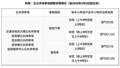 據交通事務局公佈,是次新增半小時收費安排的停車場包括交通事務局大樓公共停車場、望賢樓公共停車場、望善樓公共停車場、望德樓公共停車場及望廈體育中心公共停車場。該5個停車場實施新收費模式後,輕型汽車的日間(上午8時至晚上8時前)泊車費用為每半小時3元,夜間(晚上8時至翌日上午8時前)為1.5元;重型及輕型摩托車的日間泊車費用為每半小時1元,夜間為0.5元。