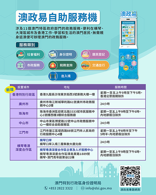 有關“澳政易”自助服務機的詳情,可參閱相關專題網頁https://www.dsi.gov.mo/mo-eservice/。