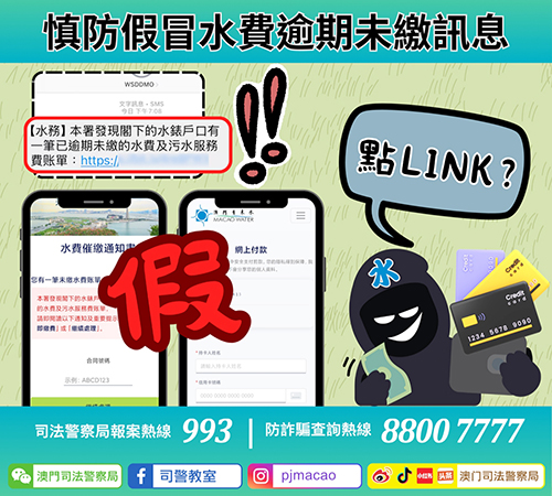 【本報訊】司警局昨發佈警情通告指,近日有騙徒向市民發送附有連結的詐騙短訊,訛稱市民“有一筆已逾期未繳的水費”,點擊有關連結後將會進入一個假冒澳門自來水股份有限公司的網頁,並顯示有“水費催繳通知書”字樣,以此誘騙市民輸入信用卡資料、一次性交易驗證碼以進行未經授權之大額交易,呼籲市民慎防該類短訊,以免上當受騙。