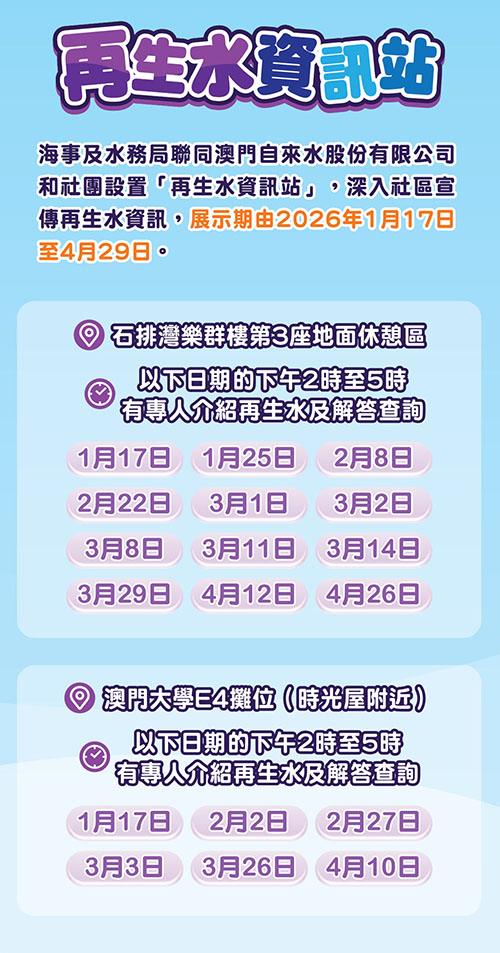 二月期間,海事及水務局及澳門自來水股份有限公司將繼續於指定日期的下午2時至5時,派出專員駐場解答居民查詢,並聽取居民意見。其中,設於澳門大學E4劉少榮樓的“再生水資訊站”專員駐場日期為2月2日及27日;設於石排灣樂群樓第3座休憩區的“再生水資訊站”專員駐場日期則為2月8日及22日。現場設有互動遊戲及資訊展板,歡迎居民到場參觀了解再生水資訊。詳情可瀏覽海事及水務局網站 www.marine.gov.mo。