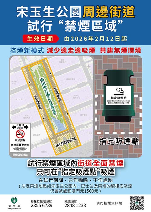 衛生局表示,宋玉生公園周邊試行禁煙期間,局方工作人員將不定期巡查,若發現吸煙者沒有在“指定吸煙點”範圍內吸煙,只作勸喻,不作處罰。吸煙者需留意,在法定禁止吸煙地點如宋玉生公園、巴士站及其他禁煙地點吸煙,將被處罰澳門元1,500元。局方將持續評估試行區域的實施成效,並吸取經驗作出優化措施,為日後修改《控煙法》提供參考依據。
