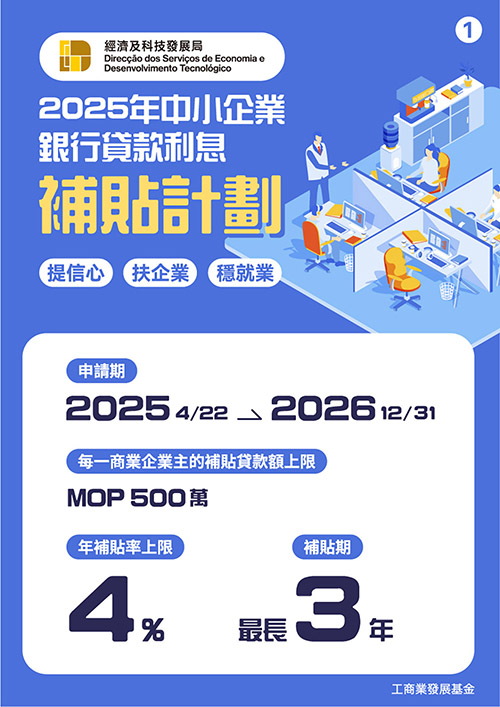 特區政府於去年4月22日推出中小企業銀行貸款利息補貼計劃,以貸款利息補貼的方式向中小企業提供資助,減輕融資成本,支持企業補充資金流,增強抗風險能力。為擴大受惠企業範圍,當局已將“2025利息補貼計劃”申請對象的資格條件調整為“於2026年3月30日或之前已向財政局申報開業的商業企業”。符合資格的中小企業,凡獲得由澳門持牌銀行批准用於企業營運的資金貸款,可透過銀行申請貸款利息補貼,每一商業企業主的貸款額上限為500萬澳門元,補貼期最長3年,年補貼率上限4厘,銀行貸款額總額上限100億澳門元。