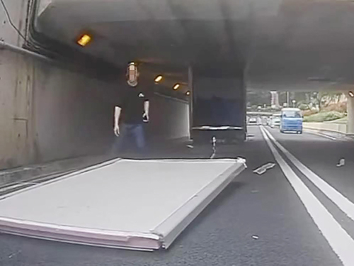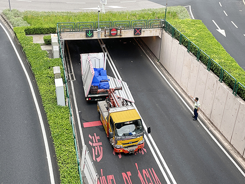 事發於昨日上午近11時,一輛密斗貨車行經羅理基博士大馬路地下行車隧道往亞馬喇前地方向行駛期間,在隧道口處先撞及懸掛標示限高2.2米的指示牌後,再前行猛撼隧道頂部,貨車頂部如“剃頭”般脫落在行車路上。事故發生後,有人下車查看。