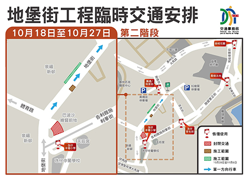 交通事務局介紹,相關工程由今日起至10月17日展開首階段施工,期間因應地堡街實施通行車輛長度限制,多條途經氹仔舊城區的公共巴士路線需改道行駛,並臨時不停靠舊城區內的若干個巴士站點,乘客可前往設置於奧林匹克大馬路近華南工業大廈的臨時站或“澳門運動場”站乘搭相關巴士路線,詳情可參閱兩巴網站(澳巴:https://www.tcm.com.mo、新福利:https://www.transmac.com.mo)。後續施工階段10月18日起將恢復公共巴士的行駛路線及停靠站點。