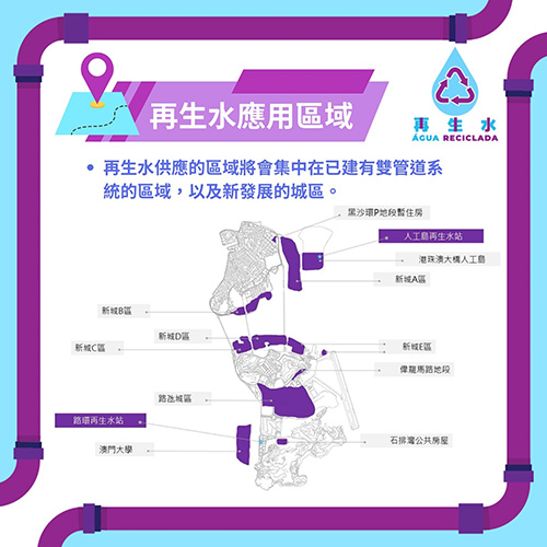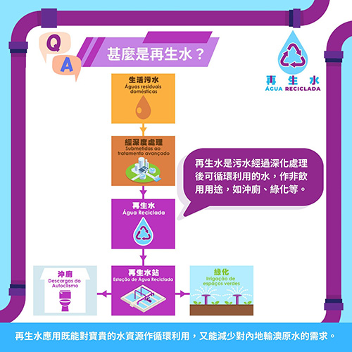 再生水是污水經過深化處理後可循環利用的水,作非飲用用途,如沖廁、綠化等。現時內地多個省市和外地也有開發利用非常規水源的成功經驗,如北京、深圳、香港和新加坡等。澳門再生水水質標準是參照國家標準《城市污水再生利用 城市雜用水水質》(GB/T 18920-2020)制訂,涵蓋微生物、消毒指標等參數,確保水質符合衛生安全要求。