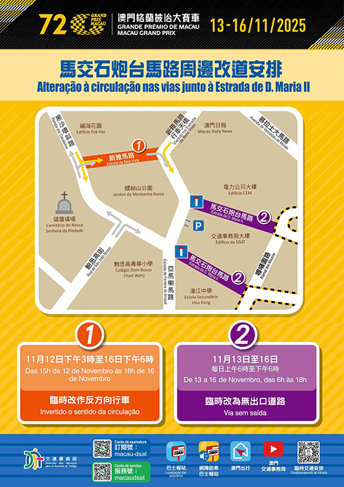 因應大賽車的舉行,今日起至週日期間,賽道及周邊道路分階段實施多項臨時交通管制措施,當中亞馬喇前地與城市日大馬路之間一段仙德麗街臨時由單向改為雙向交通,而福海花園與新雅馬路行車天橋之間的一段新雅馬路臨時改作反方向通車。此外,明日起至週日合共52條巴士路線需作臨時安排,2A特班車(2AS)及H2路線停運,12T及31T免費穿梭巴士路線分別往返外港碼頭至亞馬喇前地及綜藝館。為加強疏導賽道周邊的交通,經跨部門協調,友誼圓形地行車天橋B匝道(由A區往東北大馬路)已通車,黑沙環中街輕軌東線工程及東北大馬路行人天橋工程調整大賽車期間的施工安排,以釋放路面空間。具體的臨時交通及巴士調整可瀏覽交通事務局網站專頁(https://www.dsat.gov.mo/dsat/subpage.aspx?a_id=1761559294)。