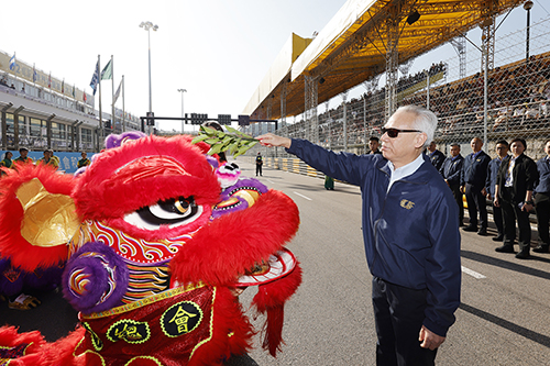 今屆大賽車壓軸賽事FR世界盃於昨日下午3時15分舉行起步禮,行政長官岑浩輝在大賽車組委會主席、社會文化司司長柯嵐等人陪同下,到賽道主持醒獅點睛及起步禮,並與參賽車手逐一握手打氣。
