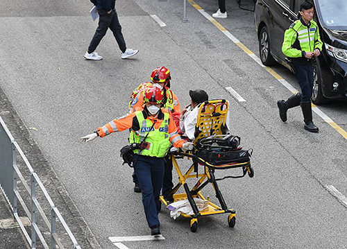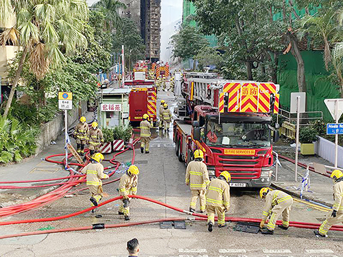 發生五級大火的宏福苑由8棟樓宇組成,其中7棟受到火災波及。香港消防處副處長(公眾安全及機構策略)黃嘉榮昨日下午在現場向傳媒介紹火災救援情況表示,消防處動用11條消防喉、8部旋轉台鋼梯車在現場進行噴水滅火,共調派200多輛消防車輛及約100輛救護車輛,出動超過1,250名消防及救護人員進行救援,同時亦利用4架無人機在低空進行熱力監察,嚴防復燃跡象。他指出,此次救援面對多重挑戰和困難,7棟涉事大樓外牆面積相當大,且搭建了竹製棚架,這些棚架令火勢迅速蔓延,並不時出現倒塌情況,加上火場溫度極高,令救援難度增加。