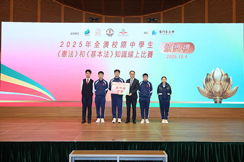 活動同時邀請澳門大學法學院高級導師、憲法與基本法研究中心研究員賴冠儒主講“從辯證法認識中國憲法的錨定作用”講座,並現場頒發感謝狀予參與普法教育展板的學校,以及嘉許全澳校際中學生《憲法》和《澳門基本法》知識線上比賽獲獎學生,初中組冠、亞、季軍分別由教業中學、同善堂中學(日校)及澳門坊眾學校奪得,而高中組冠、亞、季軍分別由教業中學、同善堂中學(日校)及菜農子弟學校奪得。