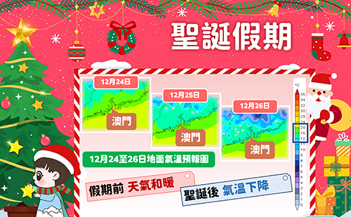 一股東北季風正影響本澳天氣。根據氣象局七天天氣預報,今日多雲,短暫時間有陽光,有幾陣微雨,吹3至5級東至東北風及有陣風,氣溫約為攝氏18℃至23℃,相對濕度介乎百分之60至95之間。明日平安夜多雲,部分時間有陽光,吹2至4級東至東北風,氣溫約為攝氏19℃至25℃,相對濕度介乎百分之50至90之間。週四聖誕節多雲,短暫時間有陽光,氣溫將跌至15℃至2℃。週五拆禮物日同樣多雲,短暫時間有陽光,最低氣溫或進一步降至 13℃。