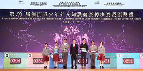 龔志明致辭時表示,習近平主席在紀念中國人民抗日戰爭暨世界反法西斯戰爭勝利80周年招待會上強調:“任何時候,我們都要堅持走和平發展道路,堅定守護世界和平安寧,攜手構建人類命運共同體。”澳門作為“一國兩制”成功實踐的典範,積極融入國家發展大局,肩負講好中國故事、傳播澳門聲音的使命。澳門青少年外交知識競賽是特區政府與外交公署合作的品牌活動,激發澳門青年對國家外交事務的興趣,展現對構建人類命運共同體的理解與擔當。特區政府將持續深化與外交公署合作,舉辦系列推廣外交知識的活動,支持青年立足澳門、胸懷祖國、放眼全球,運用所學在國際舞台上講好中國故事、澳門故事。
