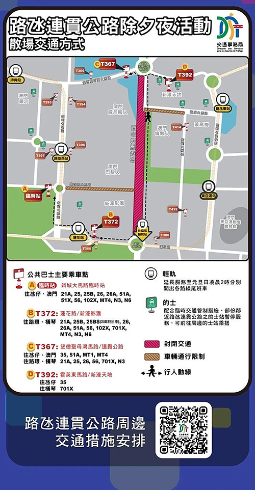 另外,路氹金光大道今晚亦會舉行跨年倒數活動及煙花表演,屆時會實施特別交通安排,包括晚上10時至11時的有限度通車措施,以及晚上11時至翌日凌晨1時的封路措施。