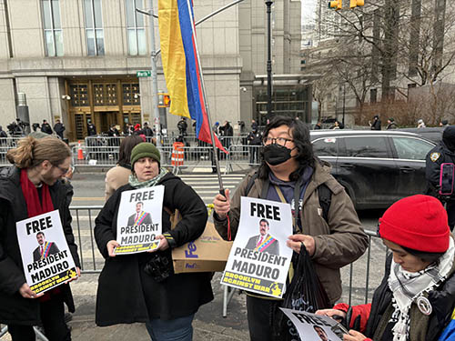法院外,抗議者聚集,呼喊口號,要求釋放馬杜羅,抗議美國軍事干涉委內瑞拉。一些人舉著“釋放馬杜羅總統”“不要向委內瑞拉開戰”“停止對委內瑞拉的非法戰爭”等標語橫幅。