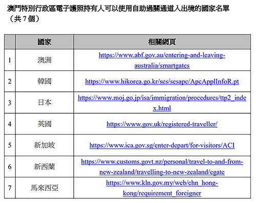 有關澳門特區護照持有人可使用自助過關通道入出境的國家名單,可瀏覽身份證明局網頁https://www.dsi.gov.mo/download/ep_autogate_c.pdf。
