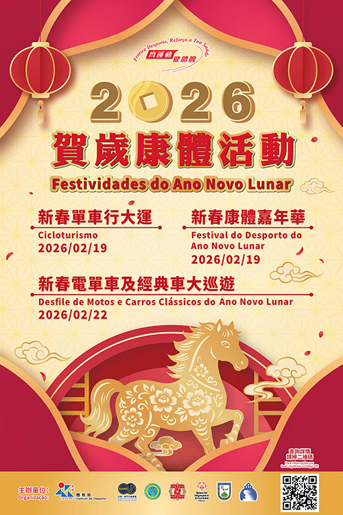 【本報訊】為喜迎甲午馬年的來臨,體育局將於農曆正月初三(2月19日)及初六(2月22日)深入社區舉辦“2026賀歲康體活動”,系列活動包括“新春單車行大運”、“新春康體嘉年華”及“新春電單車及經典車大巡遊”。活動內容豐富,尤其適合家庭親子同樂,讓大家在歡度佳節的同時,也能透過多元化的康體活動鍛鍊身心。