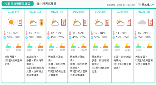 根據氣象局的七日天氣預報,今日大致天晴,氣溫約為攝氏17℃至24℃,吹3至4級東至東北風,相對濕度介乎50%至90%之間。明日是“大寒”節氣,氣溫略降,多雲,部分時間有陽光,氣溫介乎15℃至23℃。週三天氣寒冷及乾燥,氣溫介乎12℃至17℃,吹4至5級偏北風及有陣風,相對濕度介乎45%至75%之間。週四同樣天氣寒冷及乾燥,最低氣溫料進一步跌至11℃。展望週六,氣溫稍有回升,氣溫介乎14℃至20℃。